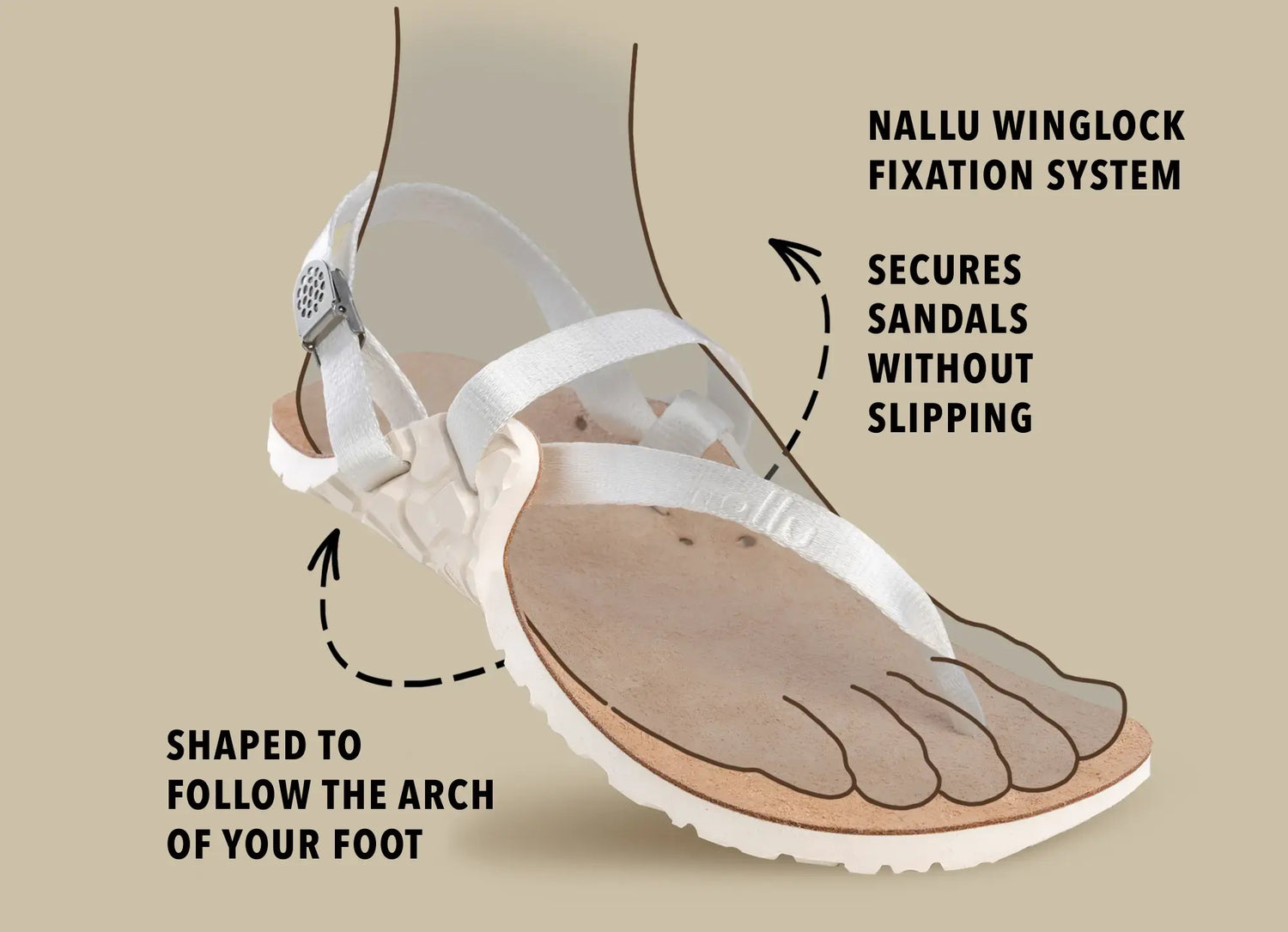 Custom-made hemp barefoot sandals with Nallu WingLock fixation system. Stay locked in place. Perfectly cushion on hard surfaces. Offer top-notch sweat-wicking to an antiseptic hemp footbed that dries quickly.